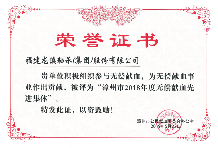公司荣获“漳州市2018年度无偿献血先进集体”称号