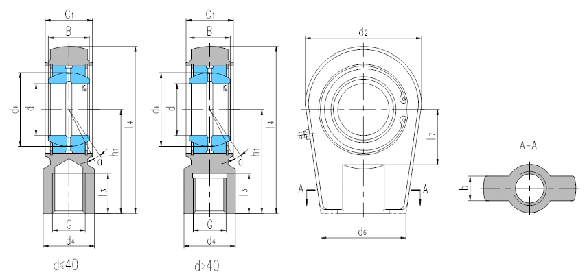 产品特点:带锁口杆端关节轴承由杆端体和向心关节轴承GE…ES组装而成,用挡圈固定,d<60,杆端体材料是碳钢,60≤d≤90,杆端体材料是碳钢或球墨铸铁,d>90,杆端体材料是球墨铸铁,SIR…ES杆端体的内螺纹带有锁口,配有螺钉紧固;SIRN…ES杆端体无锁紧螺钉,均可通过油杯润滑。