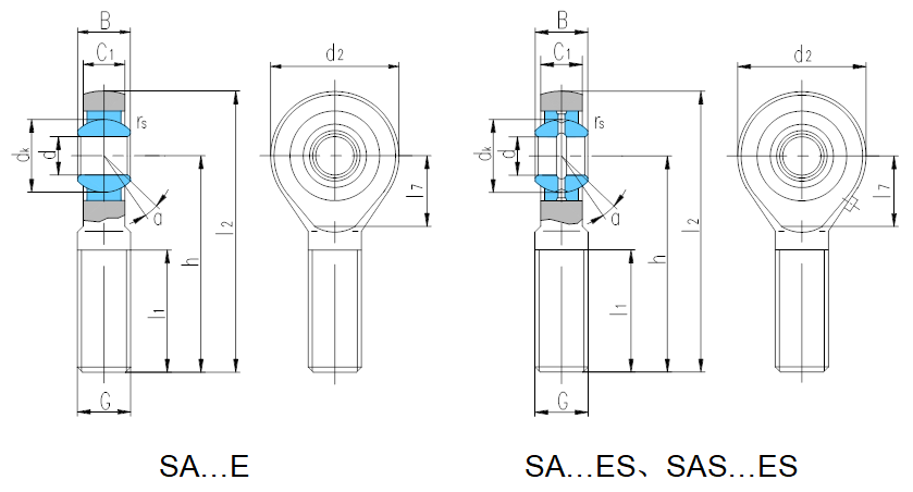 轴 承 型 号 Bearing number 外 形 尺 寸 Dimensions mm 额定载荷 Load ratings kN 重量 Weight ≈kg d B dk C1 max d2 G 6g h l1 min l2 l7 rs min αº ≈ 动载荷 Dynamic 静载荷 Static SA5E1) 5 6 10 4.5 21 M5 36 16 46.5 11.5 0.3 13 3.4 3.9 0.015 SA6E1) 6 6 10 4.5 21 M6 36 16 46.5 11.5 0.3 13 3.4 5.5 0.016 SA8E1) 8 8 13 6.5 24 M8 42 21 54 13 0.3 15 5.5 10 0.026 SA10E1) 10 9 16 7.5 29 M10 48 26 62.5 15.5 0.3 12 8.1 16 0.050 SA12E1) 12 10 18 8.5 34 M12 54 28 71 18 0.3 10 10 23 0.068 SA15ES2) 15 12 22 10.5 40 M14 63 34 83 21 0.3 8 16 32 0.120 SA17ES2) 17 14 25 11.5 46 M16 69 36 92 24 0.3 10 21 44 0.190 SA20ES2) 20 16 29 13.5 53 M20×1.5 78 43 104.5 25.5 0.3 9 30 60 0.300 SA25ES 25 20 35.5 18 64 M24×2 94 53 126 31 0.6 7 48 83 0.555 SA30ES 30 22 40.7 20 73 M30×2 110 65 146.5 35.5 0.6 6 62 110 0.875 SA35ES 35 25 47 22 82 M36×3 140 82 181 41 0.6 6 79 146 1.42 SA40ES 40 28 53 24 92 M39×3 150 86 196 47 0.6 7 99 180 1.85 SAS40ES 40 28 53 23 92 M42×3 145 86 191 47 0.6 7 99 180 2.04 SA45ES 45 32 60 28 102 M42×3 163 92 214 52 0.6 7 127 240 2.49 SAS45ES 45 32 60 27 102 M45×3 165 95 216 52 0.6 7 127 240 2.74 SA50ES 50 35 66 31 112 M45×3 185 104 241 60 0.6 6 156 290 3.58 SAS50ES 50 35 66 30 112 M52×3 195 110 251 60 0.6 6 156 290 4.07 SA60ES 60 44 80 39 135 M52×3 210 115 277.5 75.5 1.0 6 245 450 5.89 SAS60ES 60 44 80 38 135 M60×4 225 120 292.5 75.5 1.0 6 245 450 6.79 SA70ES 70 49 92 43 160 M56×4 235 125 315 95 1.0 6 313 610 8.51 SAS70ES 70 59 92 42 160 M72×4 265 132 345 95 1.0 6 313 610 11.2 SA80ES 80 55 105 48 180 M64×4 270 140 360 105.5 1.0 6 400 750 12.3 SAS80ES 80 55 105 47 180 M80×4 295 147 385 105.5 1.0 6 400 750 15.3