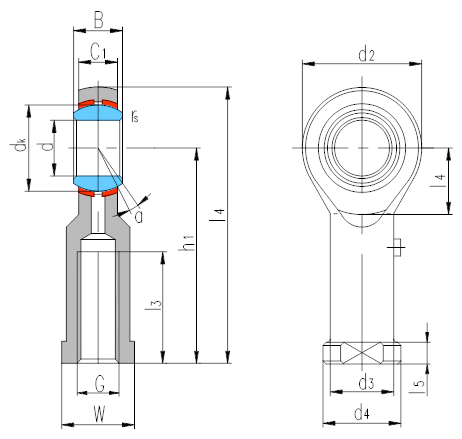 产品特点:镶垫杆端关节轴承杆端体材料是碳钢,表面镀锌,滑动表面镶入青铜衬垫;内圈材料是轴承钢,淬火,球面镀硬铬,除了孔径小于6.35外,其余均可通过油杯润滑。