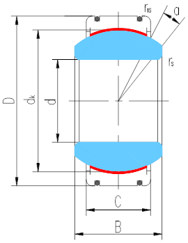 产品特点:外圈沿轴向剖分成两半,用锁圈固定,外圈材料为轴承钢,淬火,球面粘贴PTFE编织物;内圈材料为轴承钢,淬火,球面镀硬铬,后置代号有-2RS为外圈两端带有密封圈。
