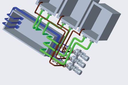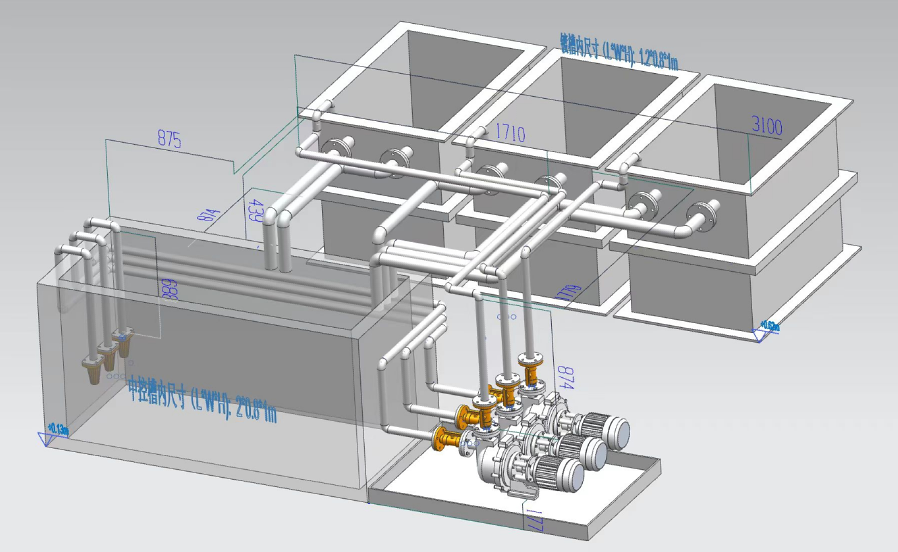 (4)施工内容:将现有CPVC镀铬中控系统管道更换为钛管道,三套镀槽溢流管路(下图绿色管)、三套镀槽进液管路(下图蓝色和棕色)及阀件全部更换,管路法兰与槽溢流口法兰以及泵连接的管道法兰螺栓孔、中心距、螺栓须一致,循环泵及槽体为现有利旧;管道系统下面设置PVC塑料接液盘,平面长宽尺寸覆盖管道、高度90mm。