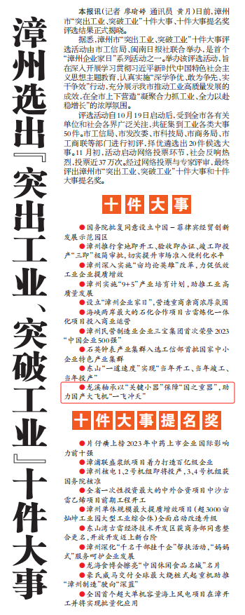漳州市“突出工业、突破工业”十件大事评选活动经市委、市政府同意,由漳州市工信局、闽南日报社联合主办,是首个“漳州企业家日”系列活动之一。评选活动自10月19日启动以来,共征集到工业各类大事50件,初评择优遴选出20件候选大事,经网络投票与专家评审,最终评出漳州市“突出工业、突破工业”十件大事、十件大事提名奖。