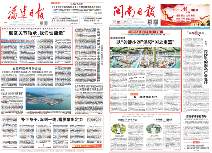 公司以国家安全为己任,自主研发全球领先的“三大核心技术”,突破国外技术和产品封锁,助力实现我国“大飞机梦”。2023年6月14日《东升国际官网入口集团自主研发出PTFE织物自润滑衬垫,打破国外技术垄断,助力国产大飞机“一飞冲天”——“航空关节轴承,我们也能造”》荣登《福建日报》头版头条,并获新华网推介;6月25日《闽南日报》头版头条专题报道《龙溪轴承集团:以“关键小器”保障“国之重器”》;获评漳州市“突出工业、突破工业”十件大事。