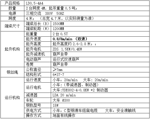 0.5吨单梁桥式起重机,需根据我司现场条件,全新安装立柱、导轨、横梁等,配置两台全新单梁桥式起重机。