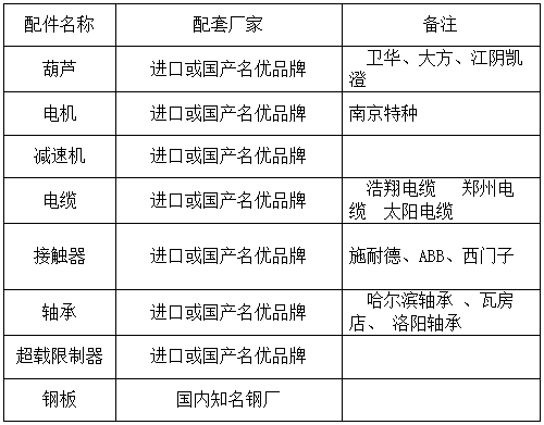 (8)起升机构:名优品牌钢丝绳葫芦(如卫华、大方、江阴凯澄等)。